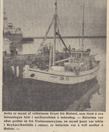 Fréttin við þessa mynd af Svaninum SK 70 í Reykjarvíkurhöfn segir okkur hversu átakanlegt það hefur verið fyrir litla þorpið okkar að verða fyrir þessu hörmulega sjóslysi haustið 1959