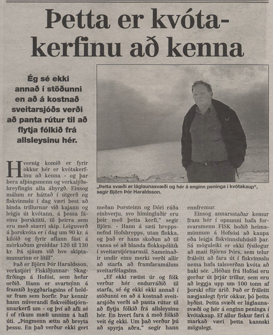 Lífskjörin í landinu - opna í Dagur Tíminn 15. október 1996 Það var ekki bjart yfir þorpinu þegar blaðamaður frá dagblaðinu Dagur Tíminn, Sigurður Bogi Sævarsson, kom og tók viðtöl við starfsfólk frystihússins og sveitastjórann í október 1996.