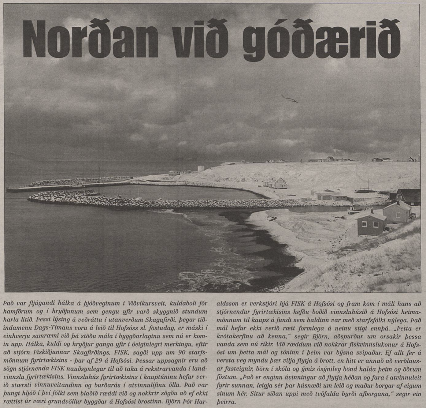 Lífskjörin í landinu - opna í Dagur Tíminn 15. október 1996 Það var ekki bjart yfir þorpinu þegar blaðamaður frá dagblaðinu Dagur Tíminn, Sigurður Bogi Sævarsson, kom og tók viðtöl við starfsfólk frystihússins og sveitastjórann í október 1996.