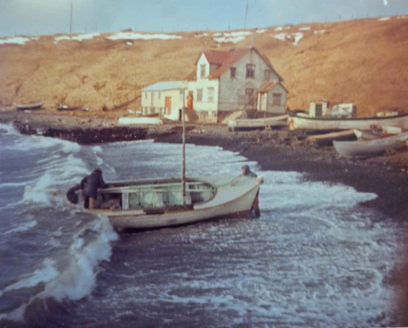 Hafnaraðstaðan var ekki uppá marga fiska hér áður fyrr, trillukarlar þurftu að vera vakandi og tilbúnir að taka bátana á land þegar gekk í sw rok. Hérna er Jónas Tobbu að hleypa Valbirni upp í fjöru undan einni brælunni.