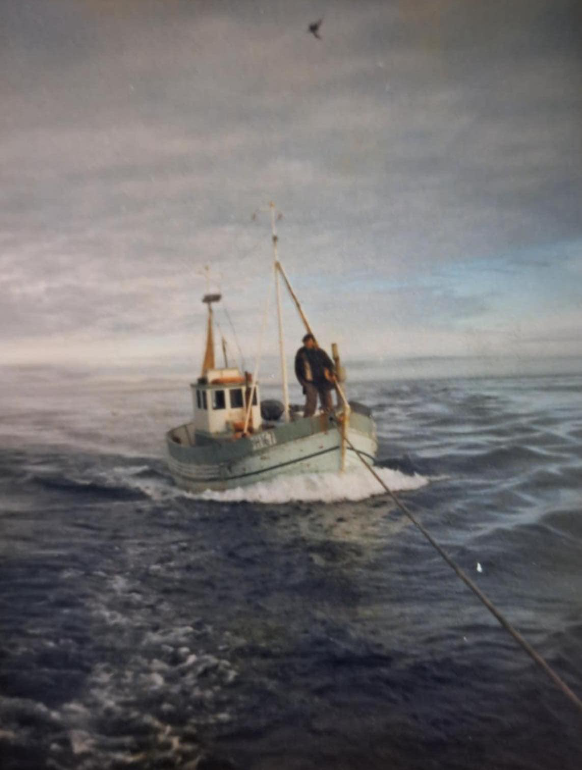 Hér eru Drafnar menn að slefa/draga bilaðan bát í land, bátinn áttu Kristján Ólason og Pálmi Rögnvaldsson í stuttan tíma, Haraldur Þór í Enni var skipverji um tíma, kannski er þetta hann eða Stjáni Óla sem stendur þarna í stafni. Bárturinn fékk nafnið Brimnes SK 18 hjá þeim mágum Stjána og Pálma.