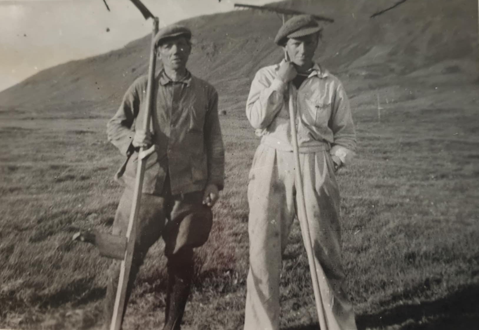Feðgar við slátt sennilega er myndin tekið á túnunum í Litlu-Brekku.