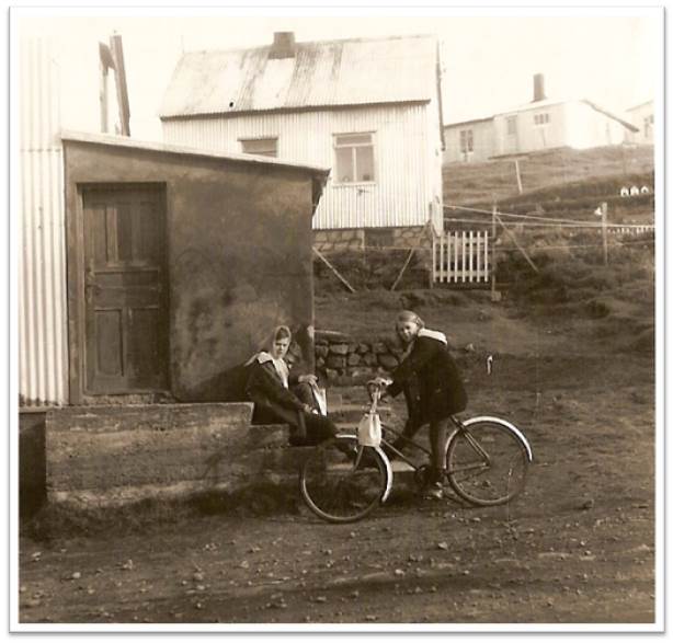 Hérna eru þær Kidda Óla og Helga eða Fanney Friðbjörns að hjóla út á frystihús.