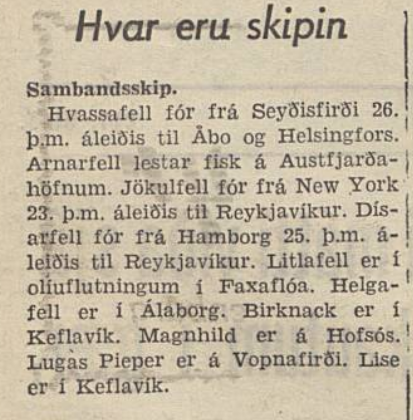 Hvar eru skipin er fyrirsögnin, allt frá því að útvarp kom til sögunnar var sagt kl. 15.oo í útvari hvar fluttningaskipin væri stödd á þeirri stundu, þarna var Magnhild stödd á Hofsós. Þetta kom svo í tímariti 1984 þessu með skipafréttirnar eftir að þeim var hætt, tóku skipin að senda veðurfréttir í rikari mæli en nokkru sinni fyrr, það var mikið hlutað á skipafréttum á þessum árum.