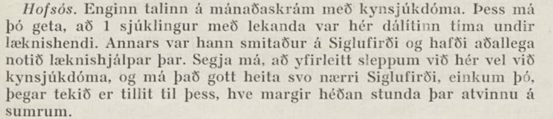 Ætli þessi sjúklingur frá Hofsósi hafi verið starfsmaður á Nafarplaninu hjá Skafta á Sigló. kannski það hafi verið svo mikið um þetta að mánaðarskrá þyrfti til þess að halda utan um þetta. Hofsósingar sluppu vel eins og segir í þessari grein þrátt við nærveru Siglufjarðar, hvers eiga Siglfirðingar að gjalda að vera bendlaðir við þetta.