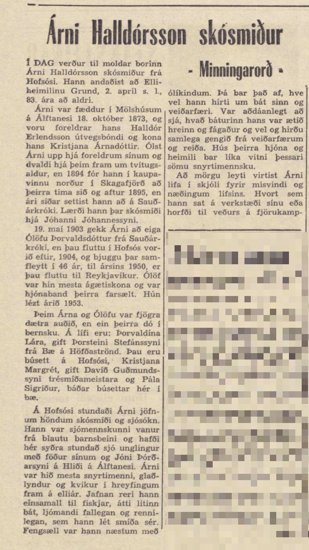 Ja hérna, ekki vissi ég að við höfum á aðra skósmiði en Ívar Björnsson (skóarann) og Jón í Lindabrekku, Jón var ötull í að sóla gömlu hvítbotnuðu gúmmískóns okkar þegar við vorum gengnir niður úr þeim. Það er virkilega gaman að rekast á svona grein þá kemur t.d. í ljós að Árni skósmiður var afi Óla Láru okkar besta manns.