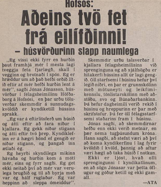 Gömul frétt frá sprengingu í félagsheimilinu Höfðaborg, fyrir sögn eins og Jónas hafi sagt hana, Jónas var að vísu einn af okkar orðheppnustu mönnum.