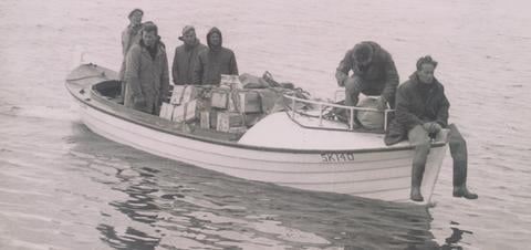 Hér eru menn að koma til lands úr Drangey eftir eggjatöku á trilunni Stormfuglinn flestir af körlunum eru af Reykjaströndinni smíðaður fyrir þá bræður á Steini og trallan var samnýtt einnig af Fagranebræðrum en tengingu við þorpið hefur myndin þar sem Friggi í Árbakka situr fremst á stefni bátsins. Önnur tenging er að smíðin er Þorgríms Hermannssonar á trillunni