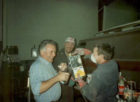 Einar formaður tékkar á blöndunni á lakkinu sem fara skal á Lappann hjá Palla og Magga Sig.