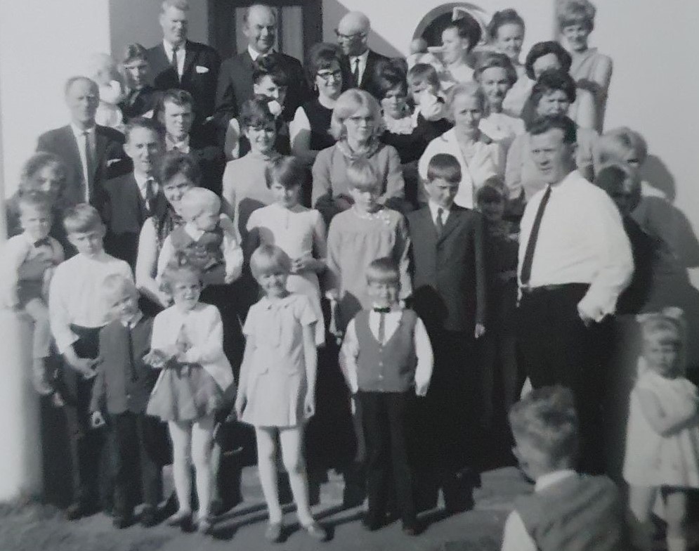 Þetta er svolítið merkileg mynd, eflaust eina myndin sem til er af öllum fermingargestum í einni og sömu veislunni. Myndin er tekin fyrir utan Suðurbraut 3 hús sem Níels Hermannsson byggði