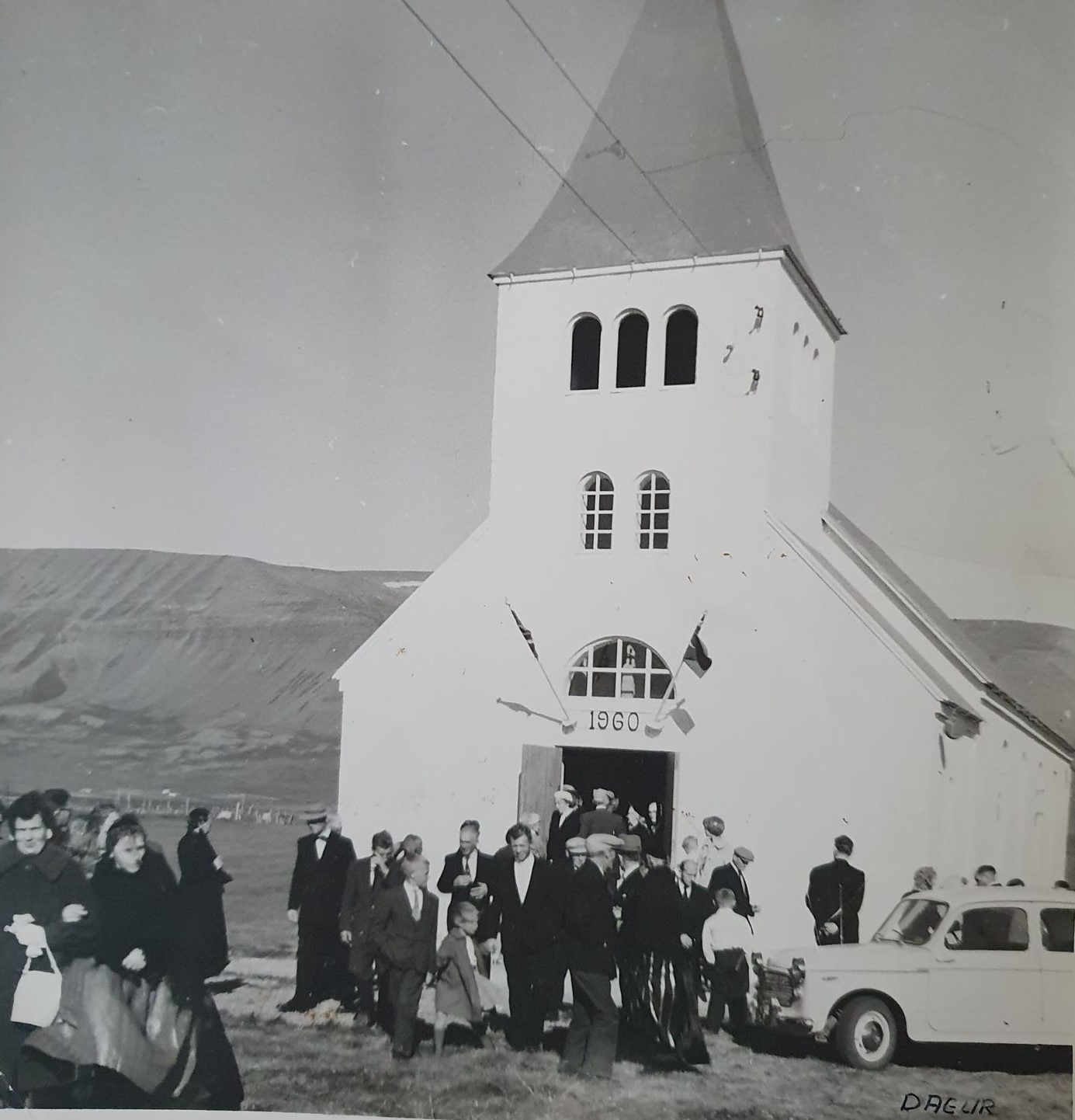 Frá vígslu kirjunnar 1960 það er gaman fyrir eigendur síðunnar að konan legst til vinstri er mamma og amma okkar feðga. Einnig sýnist okkr að bifreiðin á myndinni sé Fíatinn Jóns Ágústsonar