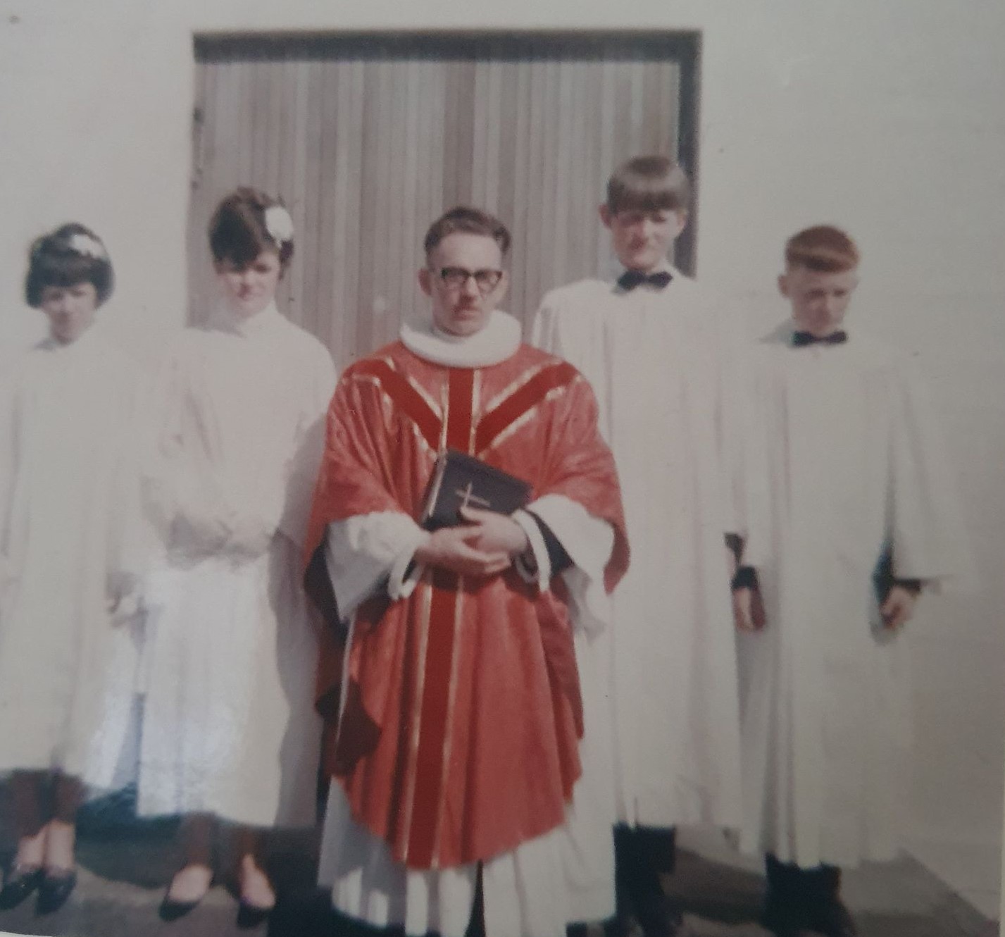 Árgangur 1954 fermdur frá vinstri Salmína Tavsen, Hanna Níelsdóttir, Sr.Sigurpáll Óskarsson Björgvin Guðmundsson og Magnús Sigurbjörnssson. Mikið væri gaman að setja inn myndir af hverjum árgangi. Því miður þá vantar okkur slíkar myndir.