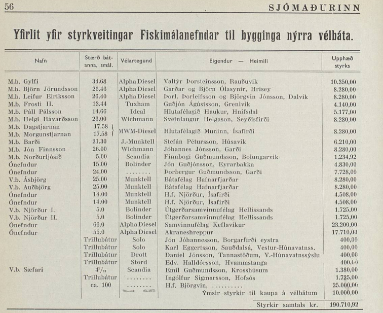 Tímaritið Sjómaðurinn 1939 yfirlit frá fiskimálanefnt um styrkveitingar vegna smíði vélbáta, það er gaman að detta um svona pappíra og þarna má sjá að Ingólfur í Bræðraborg hefur fengið eitt þúsund sjöhundruð tuttugu og fimm krónur já sæll 1.725 kr. Og ef mig minnir rétt hét trillan Ingólfs Hermóður SK ?