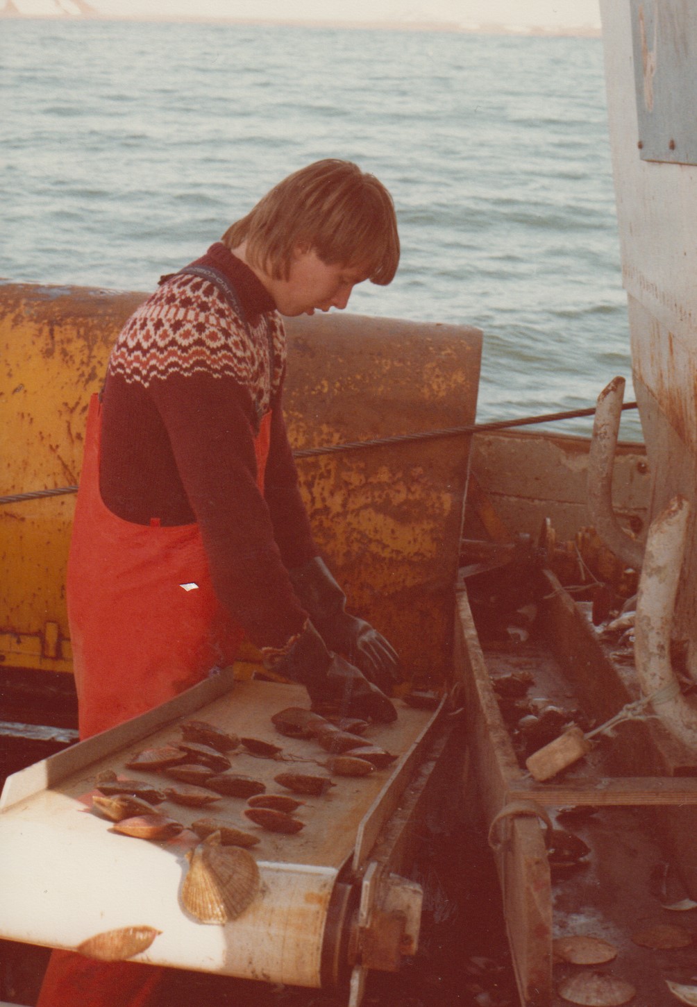 Jón Jóhann við úrtínslubandið, þess má geta að í skelplóginn kom upp nánast allt lifandi og dautt allt lífríkið sem er botnlægt, einnig alskonar ruslu t.d. hlandkoppar, meðalaglös, kolamolar og nánast allt sem horfið eða hent hefur verið í sjóinn.