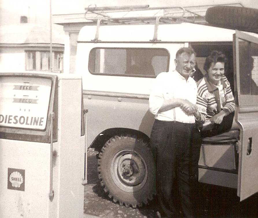Þjónustan hjá shéll /Jóa Eiríks var alltaf eða oftast á persónulegu nótunum hér er þakkað fyrir viðskiptin með handarbandi á myndinni er Jói og kúnnin er Bettý og Bubbi á Landrovernum sem alltaf bar skráningarnúmerið K 130