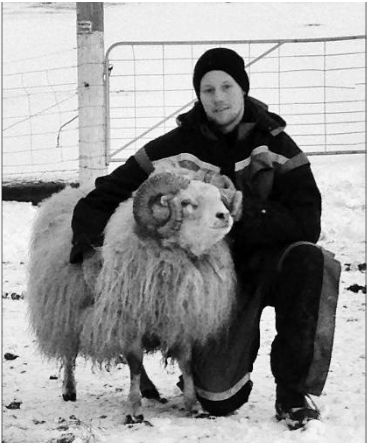 Ekki fylgt myndinni sem við fengum af bóndanum á Grindum hver fréttin var, kannski er verið að hygla hrútnum fyrir eitthvað.