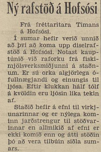 Þorpsbúar hafa verði magnaðir að nýta orku frá beinamjölsverksmiðjunnitil þess að lýsa upp híbýli sín, til gamans má geta þess að Bubbi Magg og Valli Björns voru að keyra nýju rafstöðina sem byggð var við brúna, það voru eflaust fleyri að vinna við rafstöðina og gaman væri ef þig getið sagt okkur það til þess að skrásetja það í sögu þorpsins.