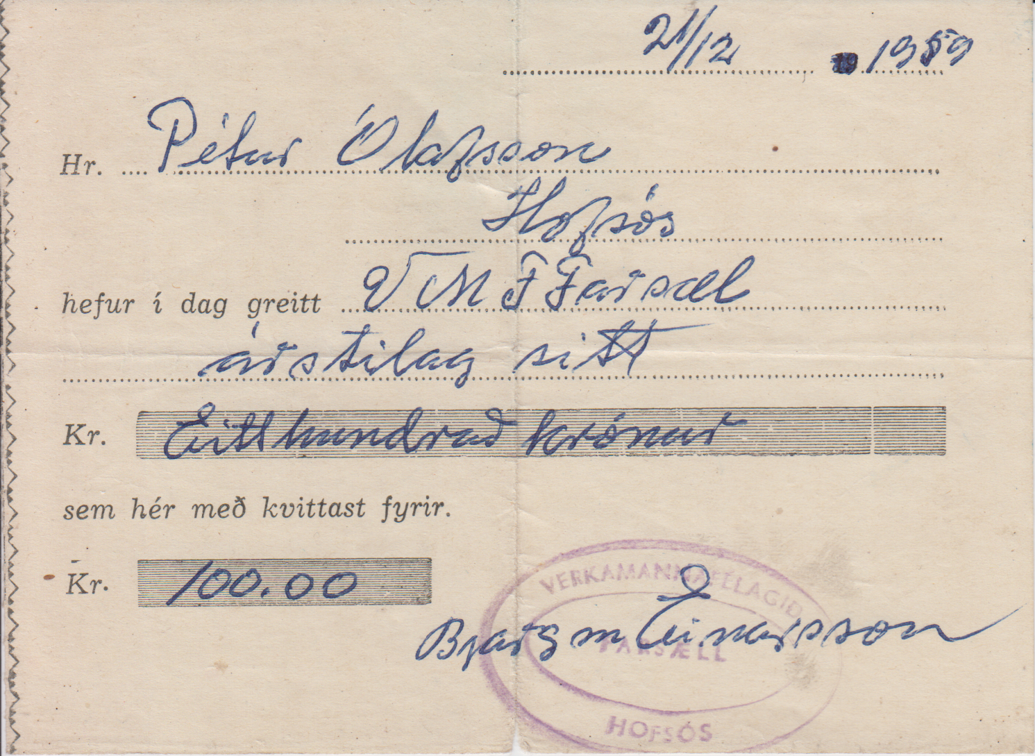 Það er gaman að komast yfir svona, hérna er kvittun fyrir árgjaldi Péturs Tavsen sem Bjargmundur Einarsson á Brekku hefur gefið út sem gjaldkeri verkamannafélagssins Farsæls Hofsósi, hundraðkall 1959 það stendur þarna árstilag sitt, kannski er árstilag skrifað sem árgjald á Færeysku.
