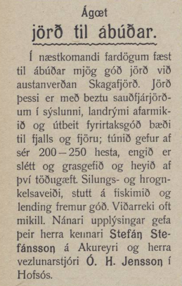 Mikið er gaman að lesa svona auglýsingar, á fardögum fæst mjög góð jörð, fardagar eru svo mikið notað í heimildir þegar lesnar eru bækur eftir Guðrúnu frá Lundi, og í bókinn Sjálfstætt fólk eftir Laxnes. En veit einhver hvaða jörð er um átt í þessari auglýsingu frá 1907