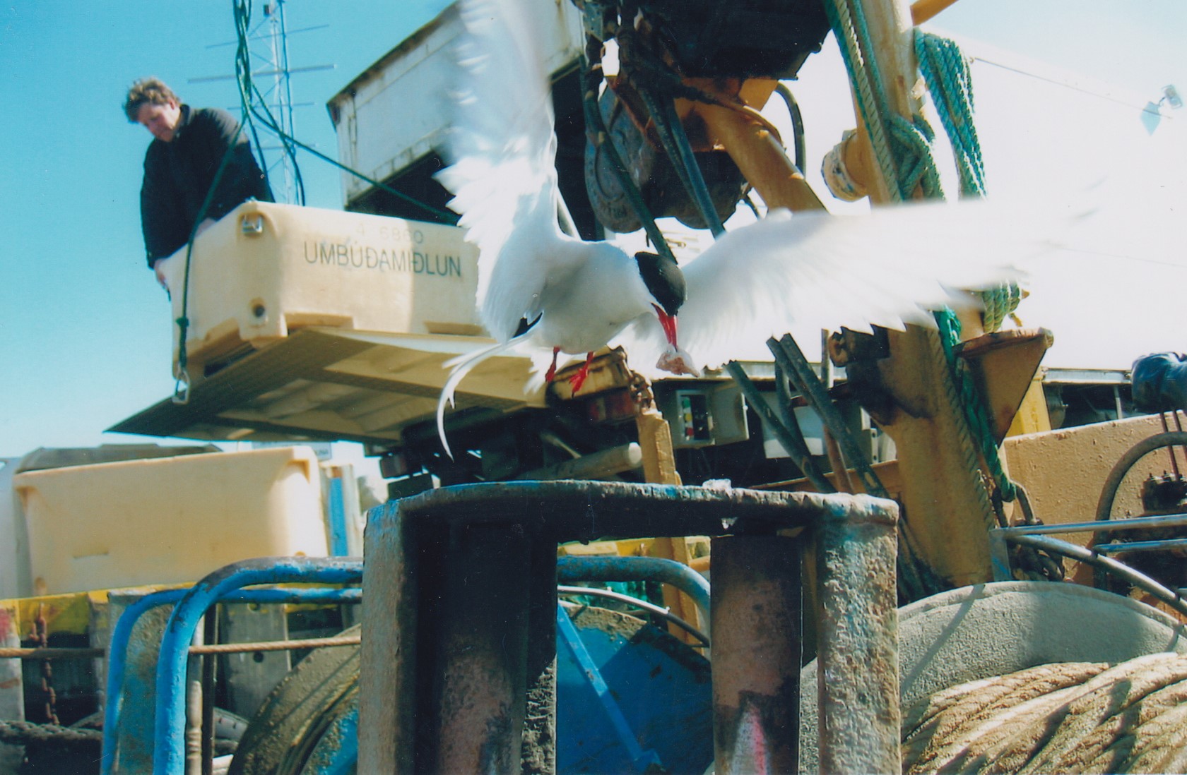 Falleg þessi mynd þar sem skipverjar eru að gefa kríu lifrarbrot.