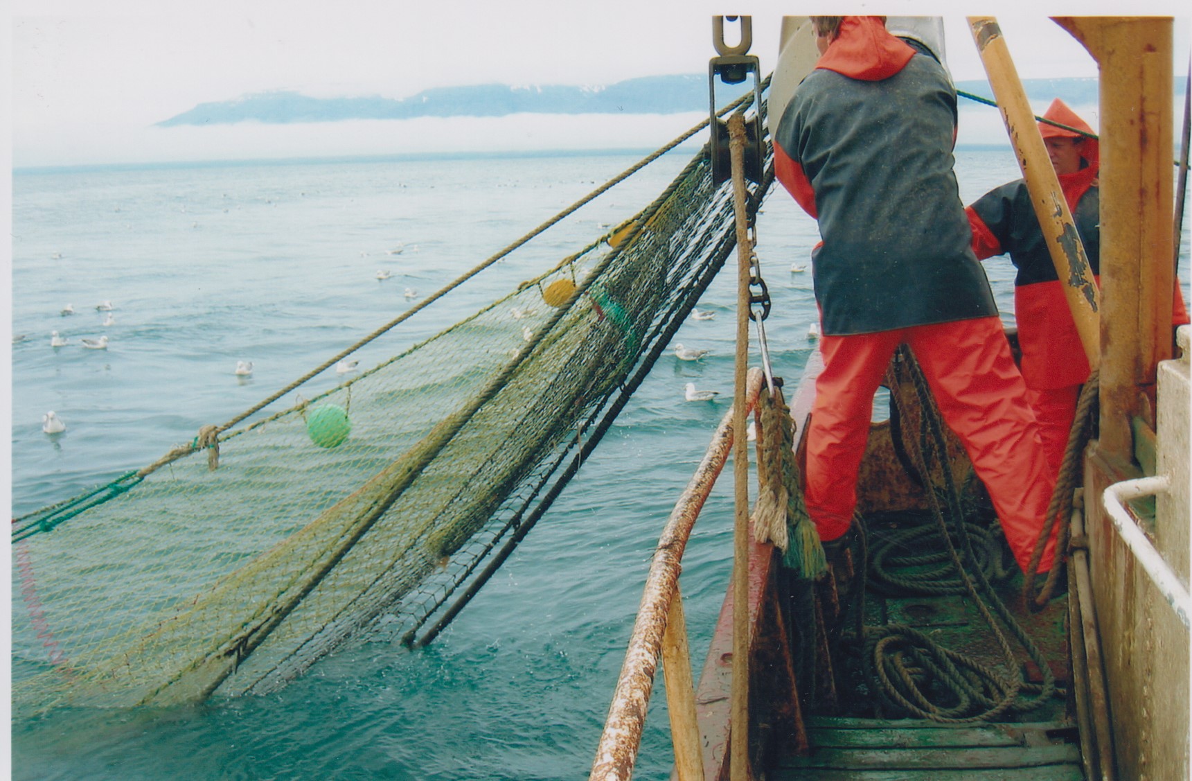 Nótin hífð inn með kraftblökk en alltaf þarf mannshöndin að koma til.