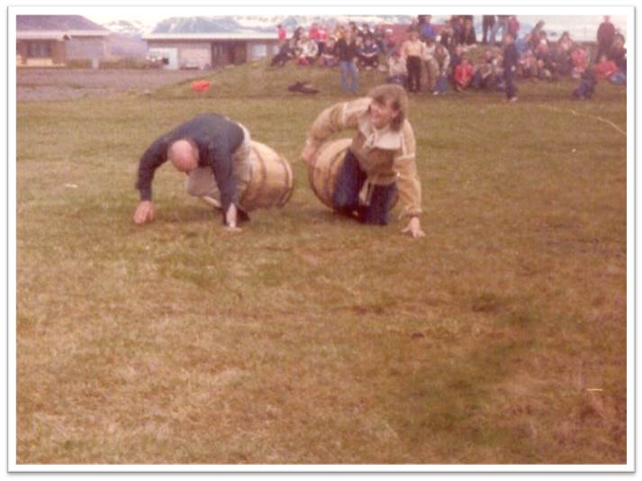 Mikil keppni í tunnuhlaupi hér má sjá Matta og Diddý í sitthvoru liðinu.