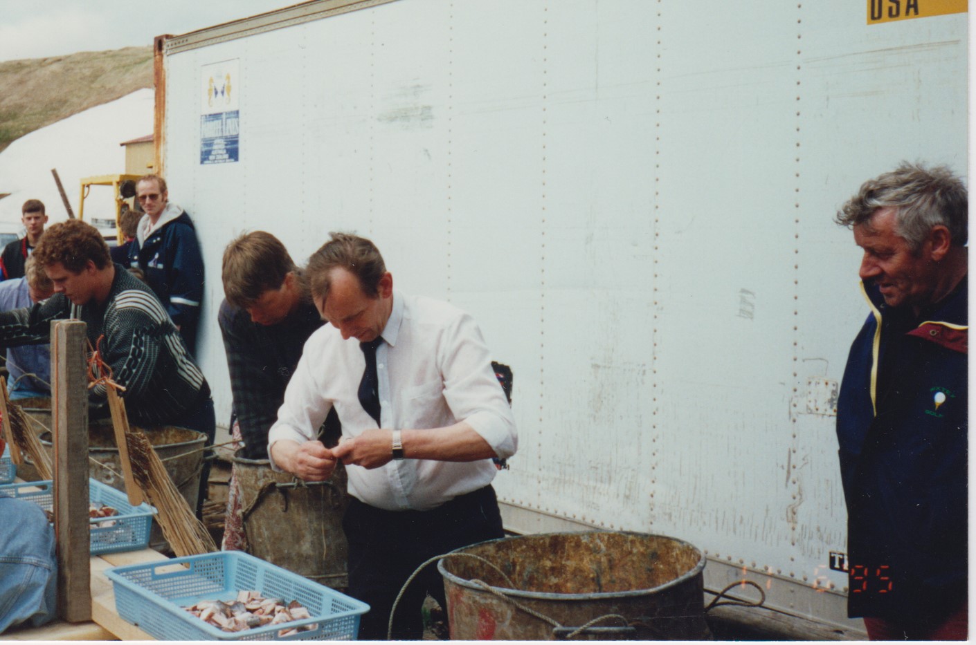 Keppni í línubeitingu á sjómannadegi, Bassi Ívars kom sá og sigraði enda flottur í tauinu. Keppendur frá vinstri Jónas Einarsson, Viggó Einarsson, Jón Jónsson og Björn Ívarsson stuðningsmaður Bassa er frændi hans Uni Pétursson.