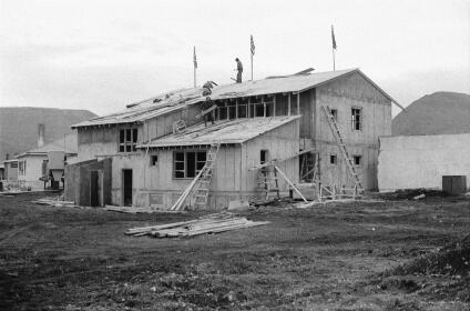 þessi er tekin þegar elliheimilið er í byggingu og eflaust á þeim tíma þegar byggingar voru taldar fokheldar eins og sjá má þar sem flaggað er á byggingunni.