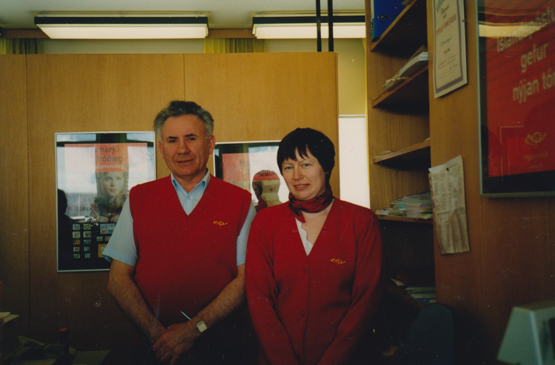 Þessi mynd er tekin áður en pósthúsið var lagt af, Einar Jóhannsson póstmeistari og Ásdís Garðarsdóttir.