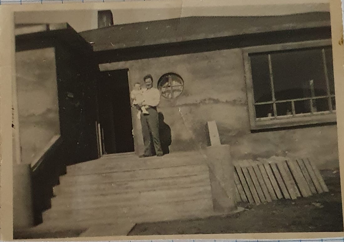 Gaman að sjá Suðurbraut 3 hér er það í byggingu eða nýbyggt. á myndinni sést eigandinn Níels Hermannsson með Hönnu dóttur sína á handleggnum.