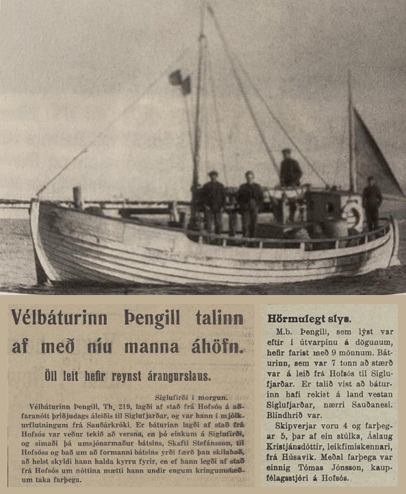 Kæru sveitungar, það er myrkur yfir síðunni okkar í dag 19.febrúar að ryfja upp þessar gömlu hörmungar, bæði af Svans slysinu og af Þengli, Þengill var í umsjón Skafta á Nöf. Skafti gerði allt til þess að stöðva för bátsins en þau skilaboð bárust aldrei til bátssins. Í annari frétt af þessu hörmulega slysi kemur einnig fram að með bátnum fórust Stefán Jónsson frá Bæ og Sigurður Jónsson sjóm. frá Hofsósi.