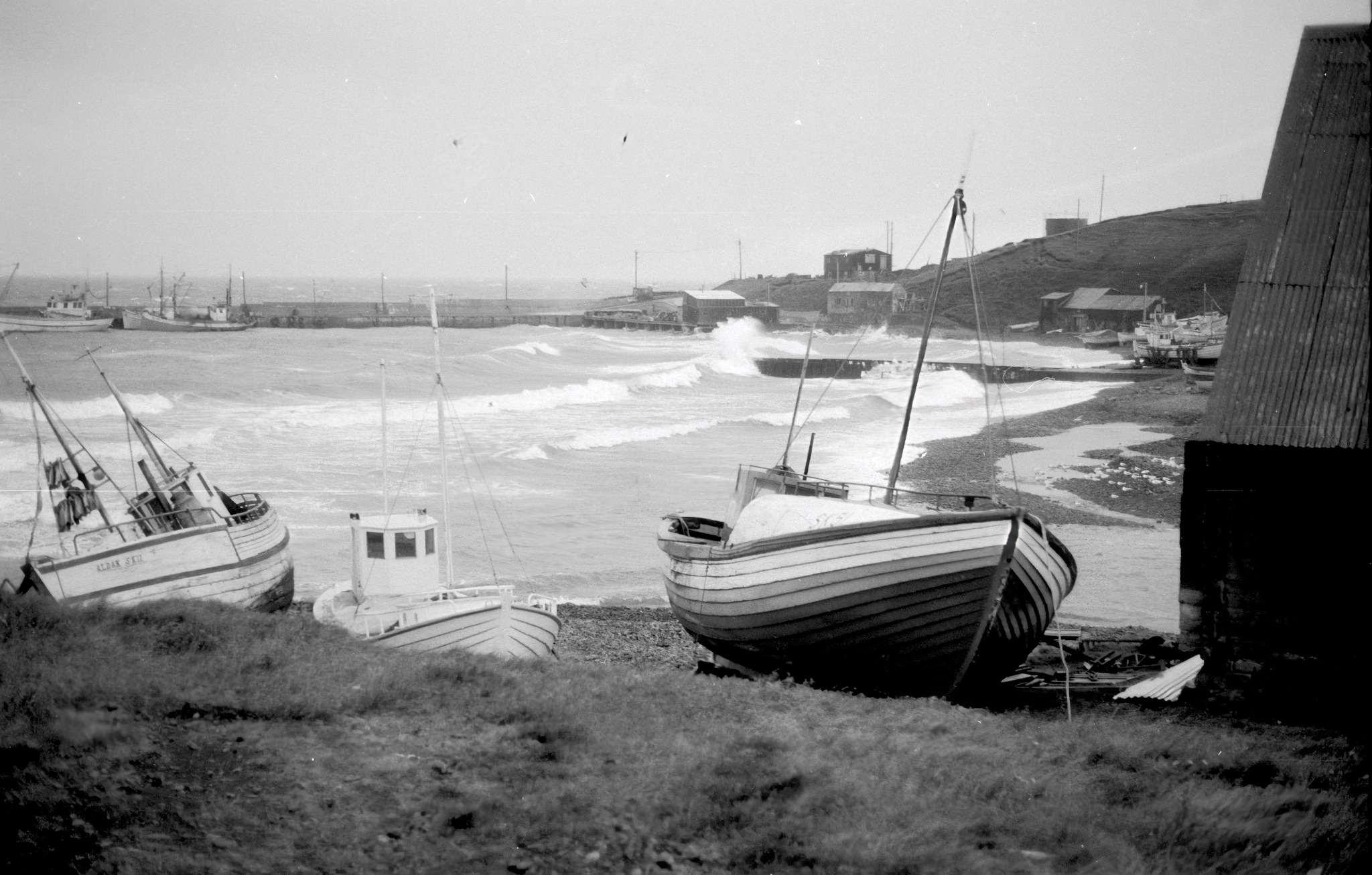 Þessi mynd frá Baldavini Jóhannsyni frá Sigló segir meira en orð fá lýst fyrir okkur gömlu þorparana, minningin fer á flug að sjá þessa mynd, þarna liggur Aldan SK 11 á hliðinna vinstra megin á myndinni en Ölduna átti Trausti Fjólmundsson frá Berglandi, trillan á milli bátana er Hafsísin SK 47 sem bræurnir Bragi og Hermann í Háaskála áttu, báturinn við pakkhúsin er svo Hreggviður SK 51 sem Sveinn Jóhanns breitti, þetta er gamall nótabátur en Sveinn byggði bæði á hann hvalbak og stýrishús, það var mikið gaman fyrir okkur guttana að fylgjast með því þegar Sveinn var að setja bátinn á land á hausti, bátnum var siglt upp í ósinn og oftar en ekki kom Óttar í Enni á jarðýtu og dróg bátinn á land. Stóru bátarnir við norður garðinn eru Frosti II, Haraldur Ólafsson og Sæberg.