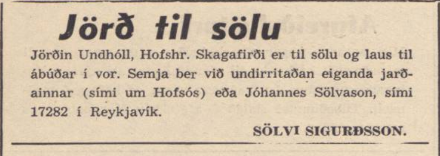 Árið1959 kom þessi jörð í Óslandshlíð í blöðin, Palli í Stóragerði gæti sennilega sagt okkur hverjir áttu Undhól, sennilega er þessi Jóhannes síðasti ábúandinn og þegar þetta er þá er Guðmundur Jónsson í Veðramóti eflaust fluttir í þorpið.