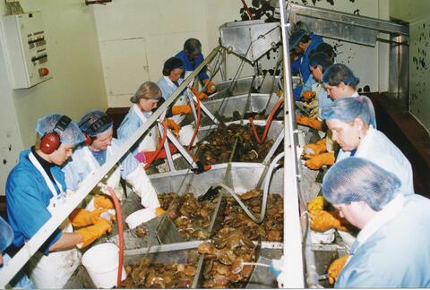 Það var nú ekki bara sultur og seyra hérna í þorpinu eins og sjá má í viðtölum við starfsfólk frystihússins og Árna sveitastjóra hérna á síðunni sett inn 11 jan. Hérna vornu nefnilega nokkuð mörg fyrirtæki þar á meðal hörpudisk skelvinnslan Skagaskel, þar sem þessi mynd er tekin. Það væri gott ef þið gætuð borið kennsl á einhverja þarna eða munið hverjir unnu þarna.
