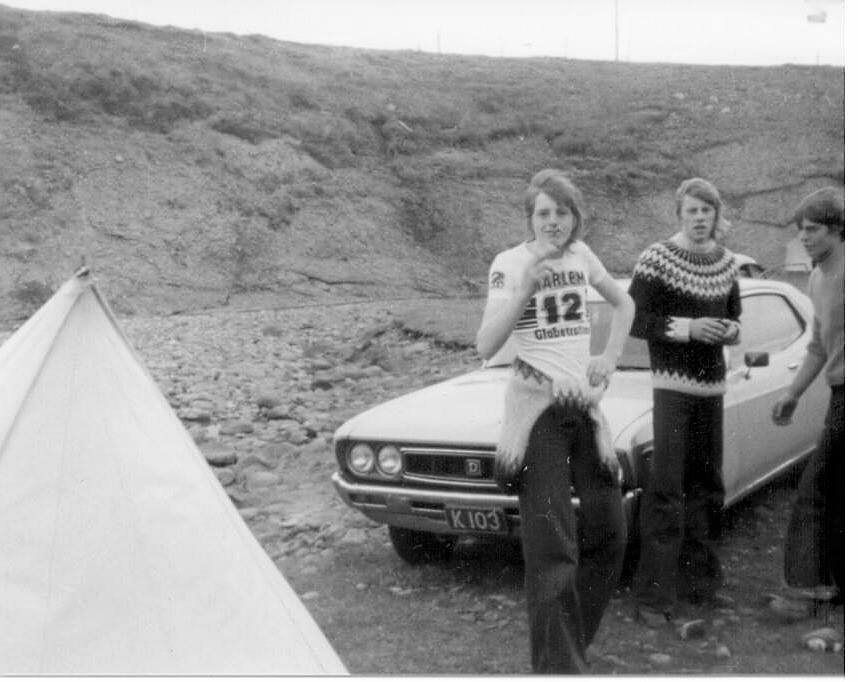 Ekki man síðu eigandi hvar þessi er tekin en eflaust á þeim tíma þegar kappinn var hjá Rarik gamla, allavegana er Jón Mannskaði þarna og bíllinn Monsa