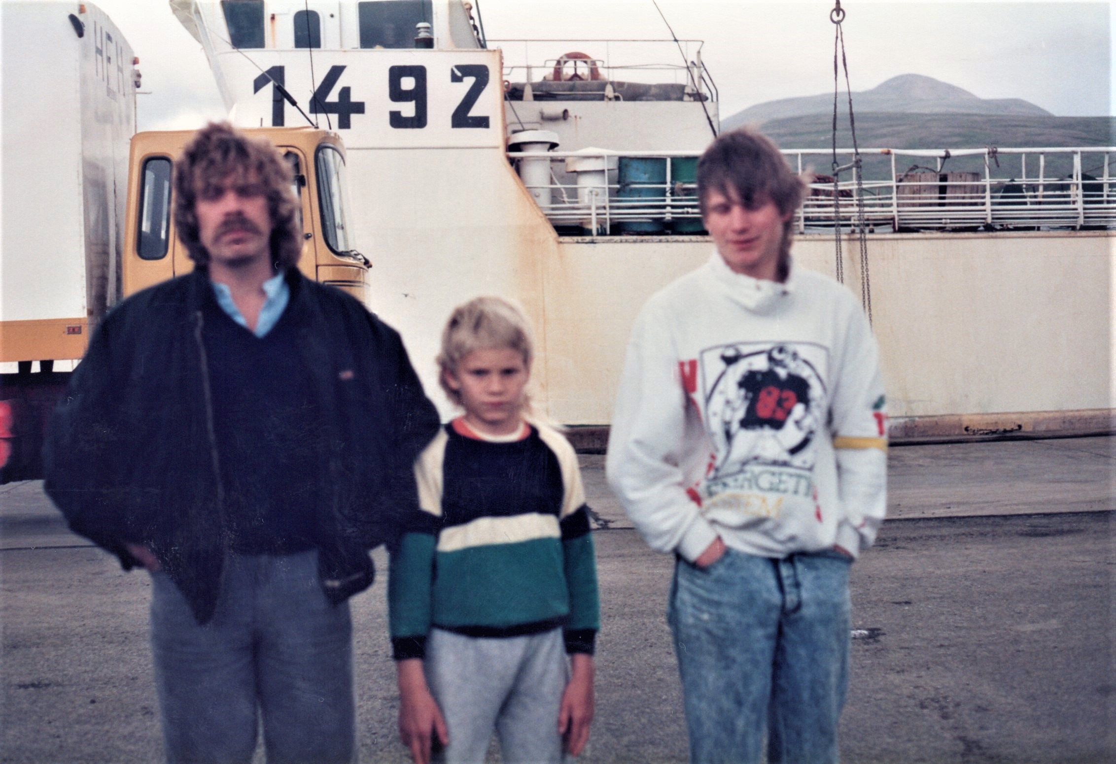 Ef vel er skoðað þá er þessi mynd tekin þegar HFH var á lífi, það sér á fluttningabílnum hann er merktur HFH þetta er bíll sem frystihúsið kaupir af Pétri Bolla móðurbróðir Bjössa í Felli sem er þarna all vígalegur í forgrunn með strákana sína Snæbjörn Hólm og Halldór. Ætli þetta sé ekki tekið þegar Bjössi og Didda bjuggu í Austurgötu 26 hér í bæ.