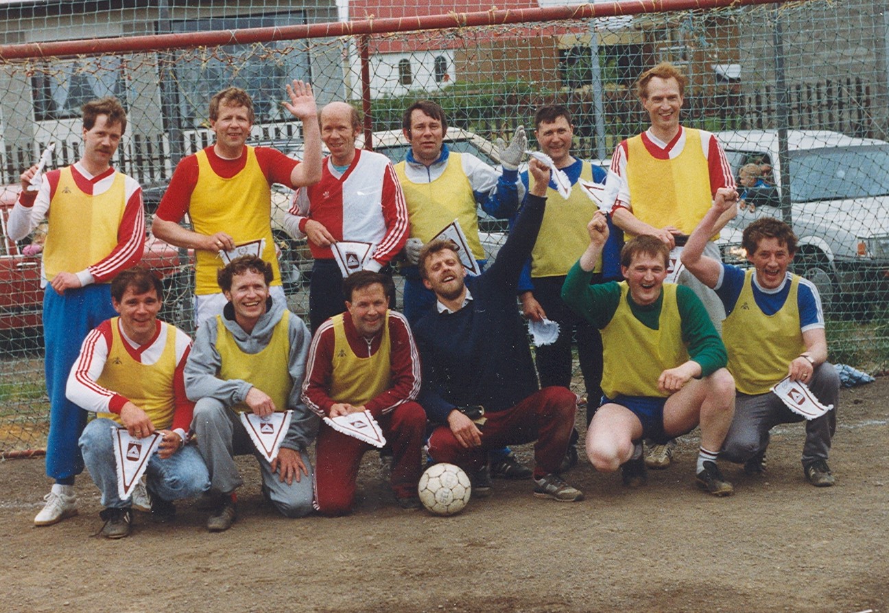 Þessar hetjur eru mættar í afmæli Hofsóshrepps eða sameinaðann Hofshrepp, allir hafa þeir fengið viðurkenningu eins og sjá má, fána með hreppsmerkinu fyrirmyndin af merki fánans er sótt í pakkhúsið. En strákarnir í þessu liði eru aftari röð frá vinstri: Þorsteinn Ólason, Pálmi Rögnvaldsson, Sigfús Ólafsson, Einar Einarsson, Jóhannes Sigmundsson og Sigmundur Guðmundsson. Fremri röð frá vinstri: Rúnar Gíslason, Gestur Þorsteinsson, Páll Þorsteinsson, Hólmgeir Einarsson, Björgvin Guðmundsson og Stefán Gunnarsson. Ártal væri vel þegið ef einhver á það í huga sér. einnig vona ég að rétt nöfn séu hjá mér á strákunum.