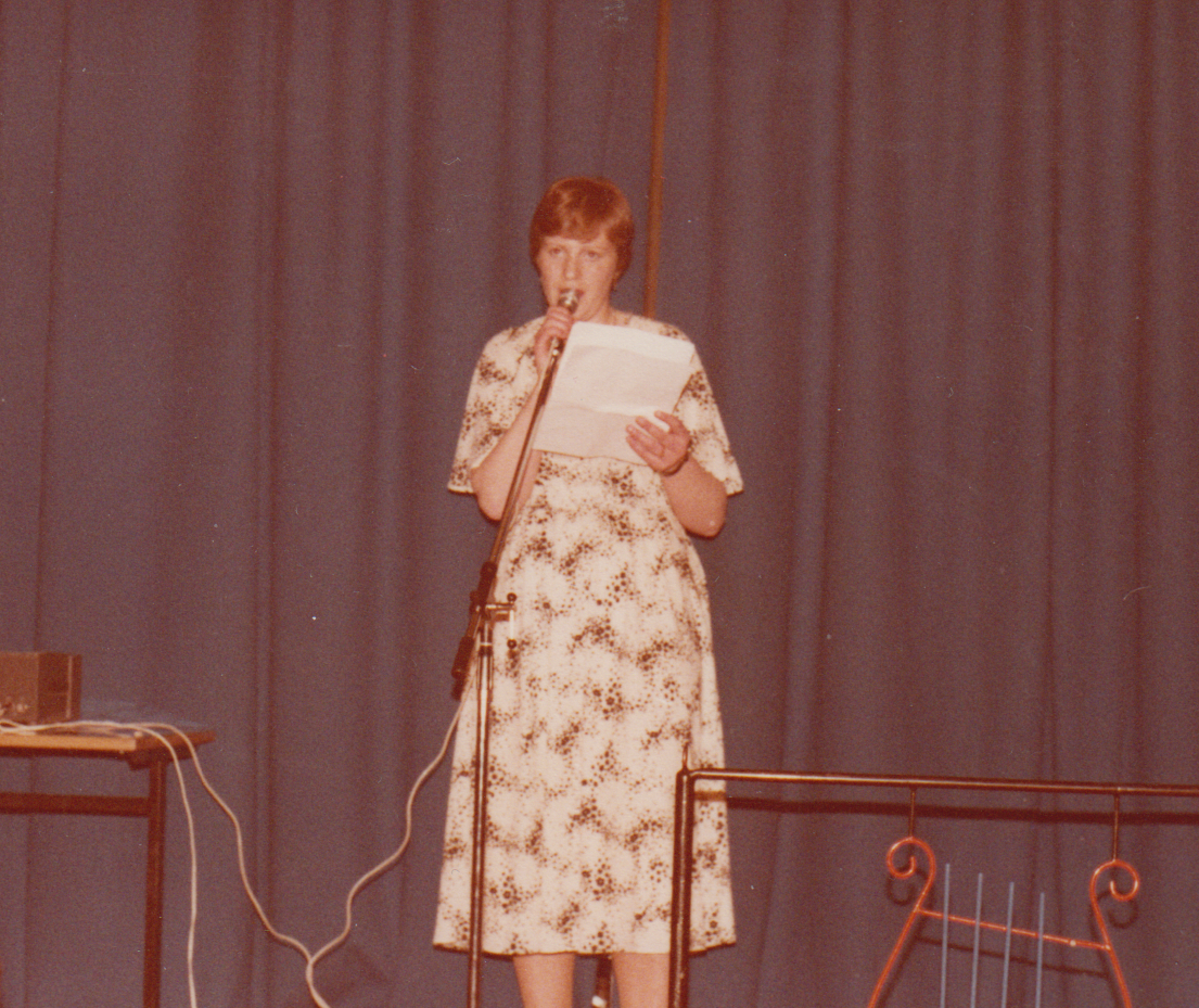 Hérna er verið að flytja einhvern pistil eða kynna skemmtiatriðin á árshátíð Ársæls.