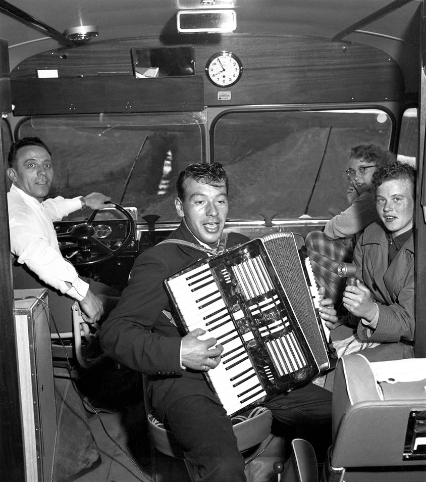 Þessi er teki þegar Búddi var að flytja fólk á síldarvertíð til Siglufjarðar Búddi undir stýri, harmonikkuleikarinn heitir Bjarni Guðmundsson Hafnfirðingur en það vantar nöfnin á síldarstúlkurnar.