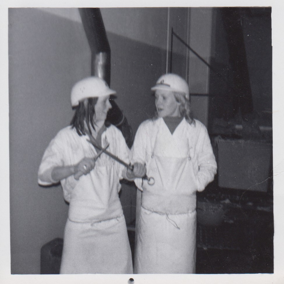 Þessi mynd er tekin á sláturhúsi KS 1973 sú sem er að stála hnífinn er Salmína Tavsen sú sem er með henni er sennilega frá Hvalnesi á Skaga Búadóttir.