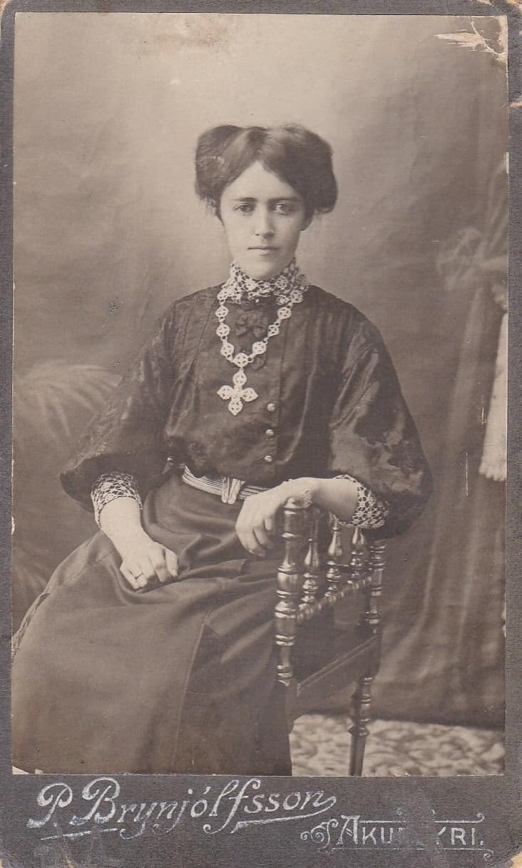 Þessi prúðbúna kona er Lilja Haraldsdóttir (1882-1944). Hún var gift Ólafi Helga Jenssyni, en þau fluttu af Króknum í Hofsós þegar Óafur gerðist verslunarstjóri hjá Poppsverslun í Hofsós 1904. "Hún var sögð nettfríð kona, djarfleg í framgöngu, sem lýsti góðu uppeldi og sjálfstrausti. Hún var allvel greind og vel gerð á allan hátt, dugmikil og stjórnsöm. Á Siglufirði hafði Lilja matsölu í allstórum stíl og hafði gott orð á sér fyrir myndarskap og góða þjónustu." segir Hjalti í Byggðasögunni. Af Ólafi eiginmanni hennar er það að segja að hann hætti hjá Popp 1910 og stofnaði fyrirtæki með Jóni Björnssyni smið frá Ljótsstöðum um verslun og útgerð. Það ár byggðu þeir myndarlegt hús sem kallað var í Hvammi eða Nafarhvammi en var síðar kallað á Sandi. (hver man ekki eftir Gunnu á Sandi?). Fór félagið vel af stað í fyrstu en fór þó svo að það fór í þrot 1922 og keypti Tómas Jónasson kaupfélagsstjóri húsið fyrir hönd Kaupfélags Fellshrepps sem síðar varð KASH. Fluttu Lilja og Ólafur þá til Siglufjarðar. Fyrir mér og minni kynslóð er þetta hús gamla kaupfélagið en þau sem yngri eru þekkja það sem Vesturfarasetrið, sem bjargað var svo giftusamlega af framsýnum Hofsósingum. - Steini Pálu
