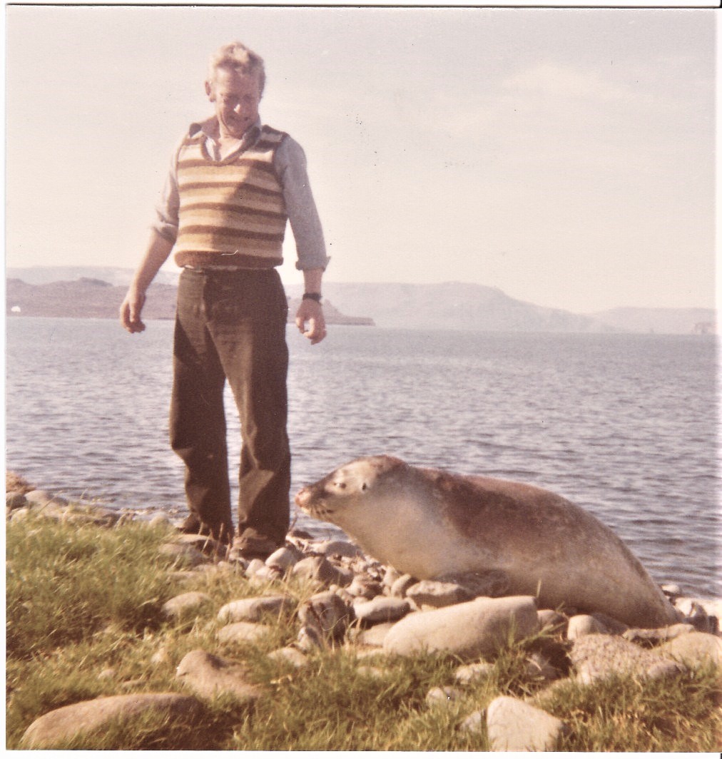Leifur á Miklabæ virðir fyrir sér sel, myndin er tekin út á Lónkotsmöl