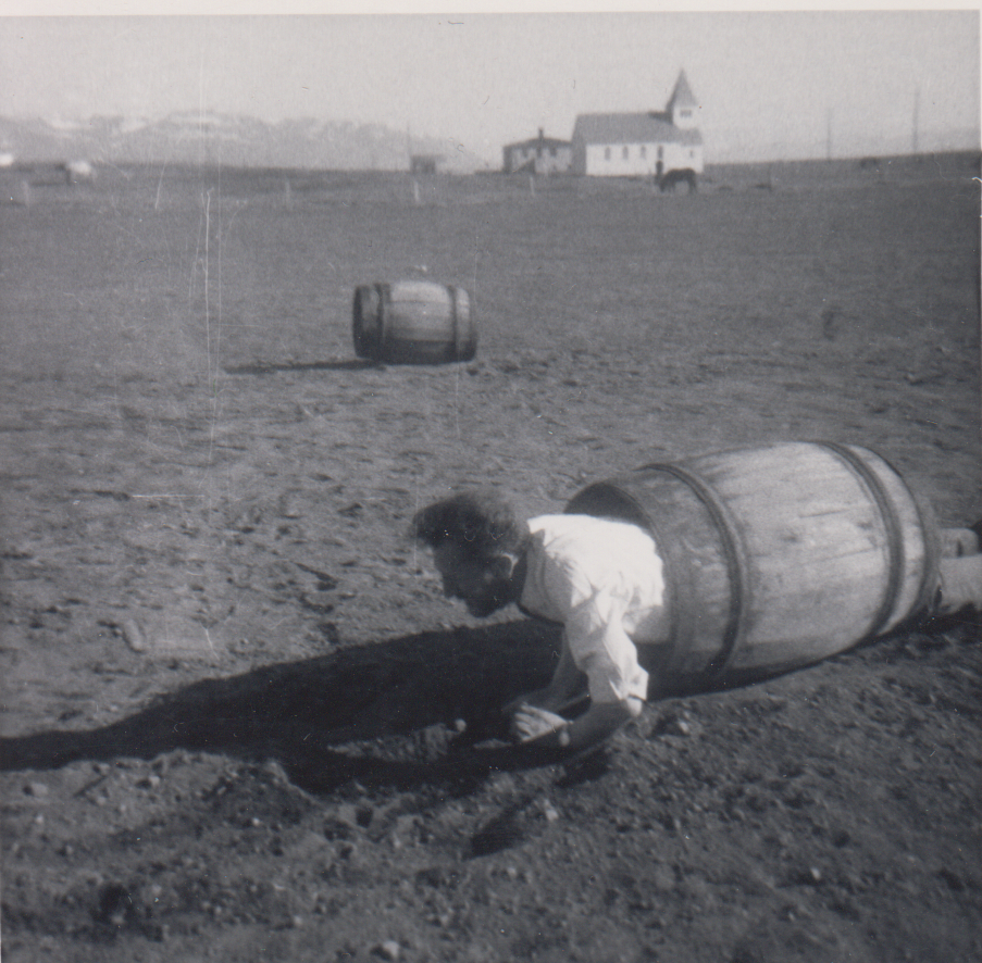 Við skjótum á það að þessi mynd sé tekin á einhvern sjómannadag, þau voru ætíð skemmtileg tunnu kapphlaupin, allir tóku þátt.