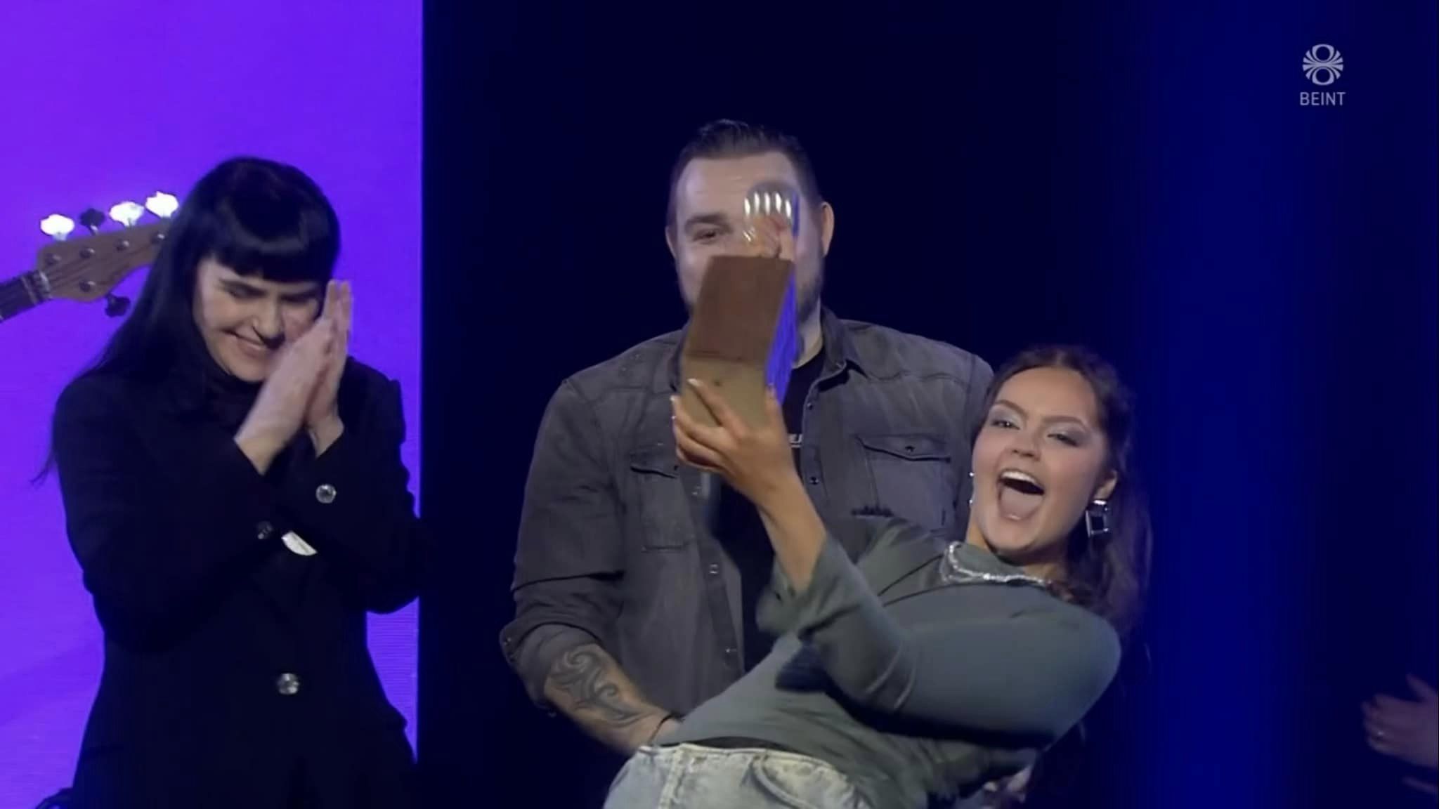 Mikill fögnuður að vinna söngkeppni framhaldskólanna, hér er tekið við hljóðnemanum 1. verðlaun 2024