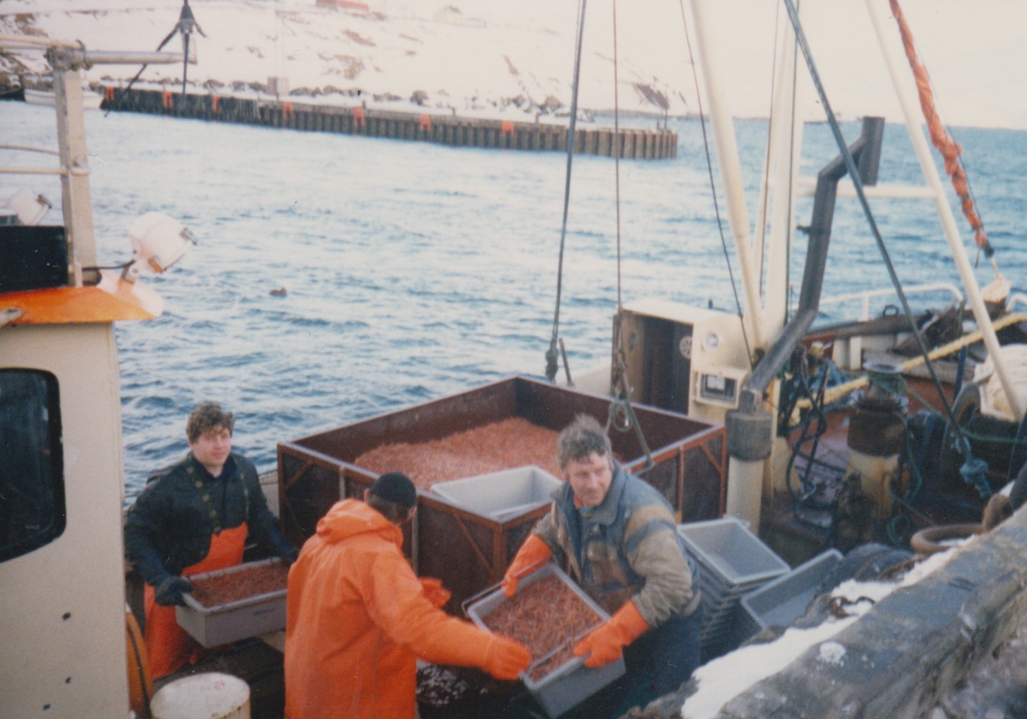 Arnar, Bragi og Uni handlanga rækjukassa upp á bryggju.