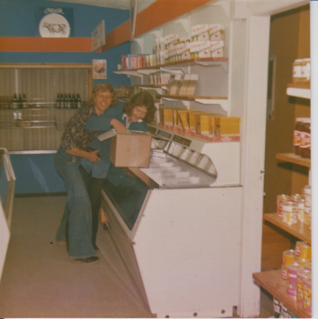 Mér sýnist að starfsmenn kaupfélagssins hafi verið áreittir í vinnunni, hér sækir einn kúnninn á manninn í kjötborðinu, fermingabróðir minn Hólmgeir Einarsson og Steini frændi minn Ólason eru þarna að gantast.
