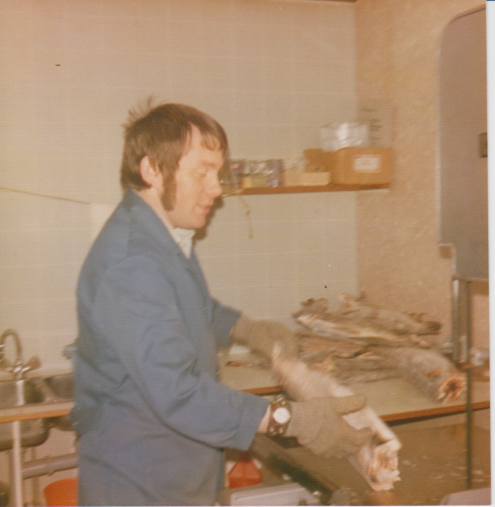 Kaupfélagið var með á boðstólunum bæði niðursagaðann frosinn fisk og frosið kjöt, Einar á Brekku vann lengi vel í kaupfélaginu og sá um að saga niður herlegheitin, bartatískan var inni á þessum árum eins og sjá má.