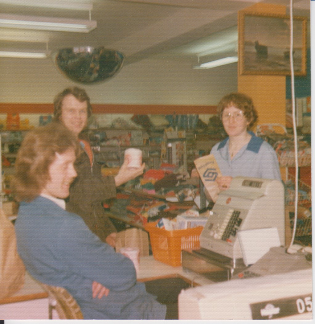Það er margt merkilegt við þessa mynd, vöruúrval er mikið m.a. málverk uppstillt á einni súlunni, fólkið á myndinni eru starfsfólkið Steini Óla og Guðný Snorradóttir, kúnninn er Guðni Óskarson sennilega nýkominn í þorpið, nú vantar ártal, eitt annað merkilegt við myndin er þegar hún er stækkuð má sjá sambandsmerkið á innkaupapokanum sem Guðný heldur á.