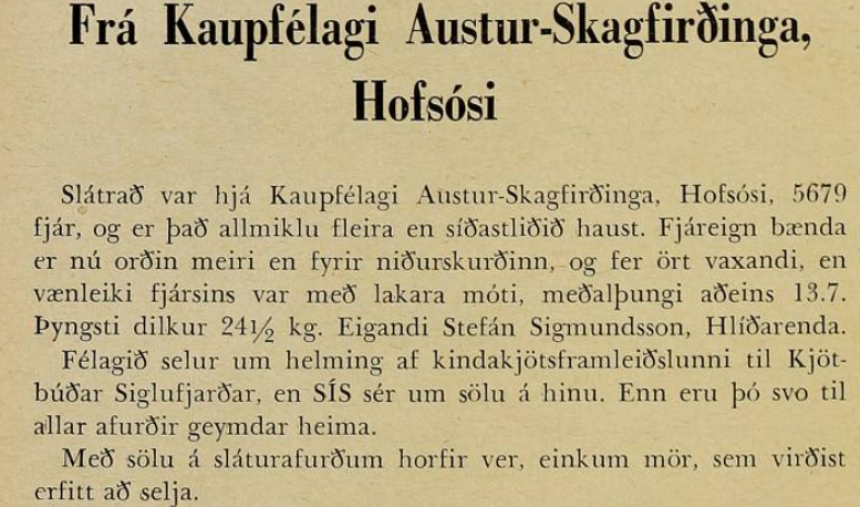 Erfitt gekk að selja mör hjá sláturhúsi kaupfélagsins en helmingur af kindakjötsframleiðslunni var selt kjörbúð Siglufjarðar en þess má geta að Kaupfélag Austur-Skagfirðinga Hofsósi átti helming kjörbúðarinnar á móti verslunarmannafélagi Fljótamanna í Haganesvík, já hróður kaupfélagsins fór víða. Meðalþungi dilka í slátrun var í lakaramóti en Stebbi á Hlíðarenda átti þann þyngsta 24,5 kg.