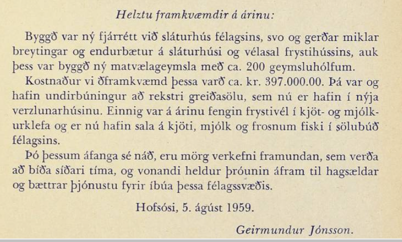 Það snérist margt um slátrun og sláturhús í þorpunu, kaupfélagið framkvæmdi mikið er snéri að frysti og sláturhúsi sínu, það er gaman að ryfja upp þessa tíma þegar maður var sendur niður í frystihús til þess að sækja mat í frystigeymslurnar sem voru eins og segir í greininni 200 talssins öll númeruð og hvert hús hafði sitt númer, maður setti húfu á hausinn og vettlinga á hendurnar og hljóp inn að því hólfi sem sækja átti í þar sem mikið frost var í geymslunni, þetta voru merkilegar geymslur það var mjór langur gangur á efrihæð frystihússins með ca. 80 cm. breiðum hólfum sem voru með hurðum klæddum hænsnanetum þannig að hver sem inn fór sá allt sem þorpsbúar geymdu þar inni, hengilás var á hverju hólfi og í verkstjórakompunni var stærðarinnar spjald númerað hverju húsi og lykillinn af hólfunum geymdur þar, Björn Björnsson og síðan Þórður Kristjánsson verkstjórar afhentu okkur krökkunum lykla af hólfunum.
